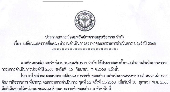 ประกาศสหกรณ์ฯ เรื่อง "เปลี่ยนแปลงรายชื่อคณะทำงานดำเนินการสรรหากรรมการ"