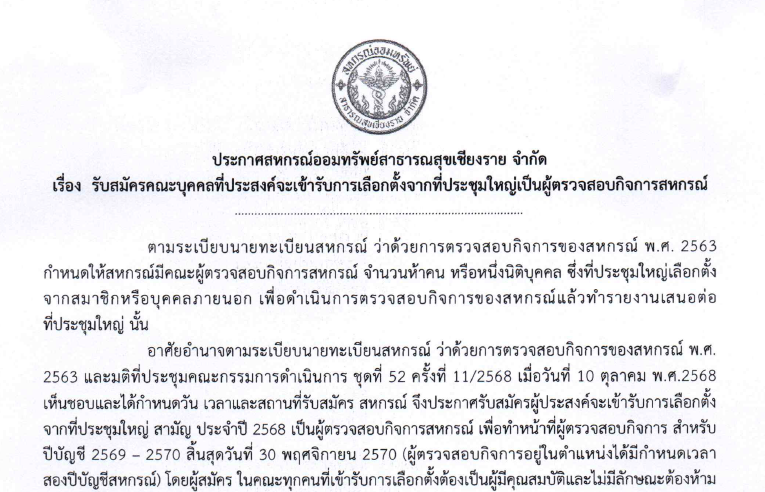 ประกาศสหกรณ์ฯ เรื่อง "รับสมัครคณะบุคคลที่ประสงค์จะเข้ารับการเลือกตั้งจากที่ประชุมใหญ่เป็นผู้ตรวจสอบกิจการสหกรณ์ฯ"