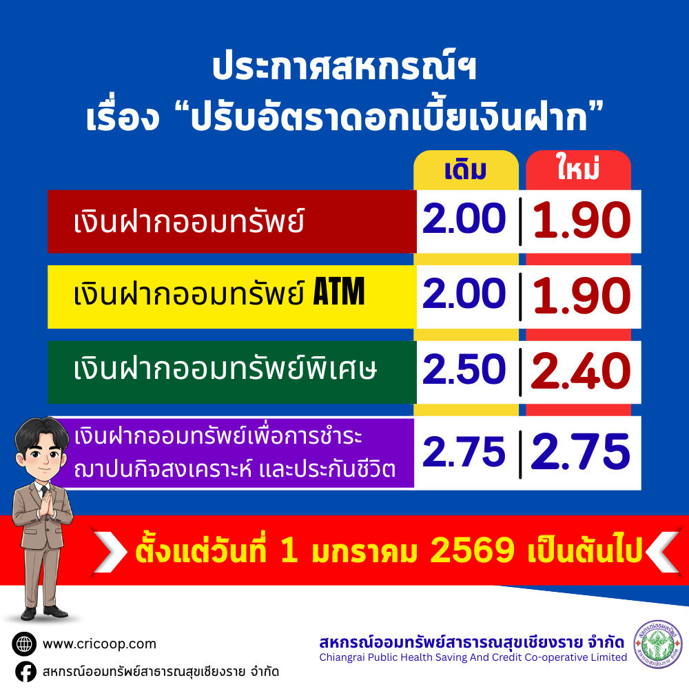 ประกาศสหกรณ์ฯ เรื่อง "ปรับอัตราดอกเบี้ยเงินฝาก" เริ่มตั้งแต่วันที่ 1 มกราคม 2569 เป็นต้นไป